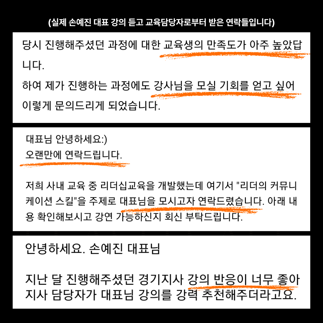 삼성전자, 삼성디스플레이, 현대자동차, 메르세데스 벤츠, 아우디코리아, 서울신라호텔, 캐딜락하우스서울, 스텔란티스 코리아, 현대글로비스, 오토벨, 마이크로소프트, 한화생명, KT Telecop, 블루핸즈, 바인그룹, 동아쏘시오, 게스코리아, 교원, 한국전력공사, 한국과학기술연구원, 국가기술인력개발원, 인천교육연수원, 서울경제진흥원, 명동가톨릭회관, 대한불교조계종, 메가마트, 포시즌휘트니스, 코람코자산신탁, 한국기술교육대학교, 한국생산기술연구원, 한국과학기술연구원, 국립기상박물관, 서울시민대학, 오산시시설관리공단, 전주시설관리공단, 인천국제공항공사, 경기도농업기술원, 소방재난본부, 동덕여대 교수학습센터, 경희대학교, 인천대학교, 신한대학교, 고려사이버대학교 외 다수