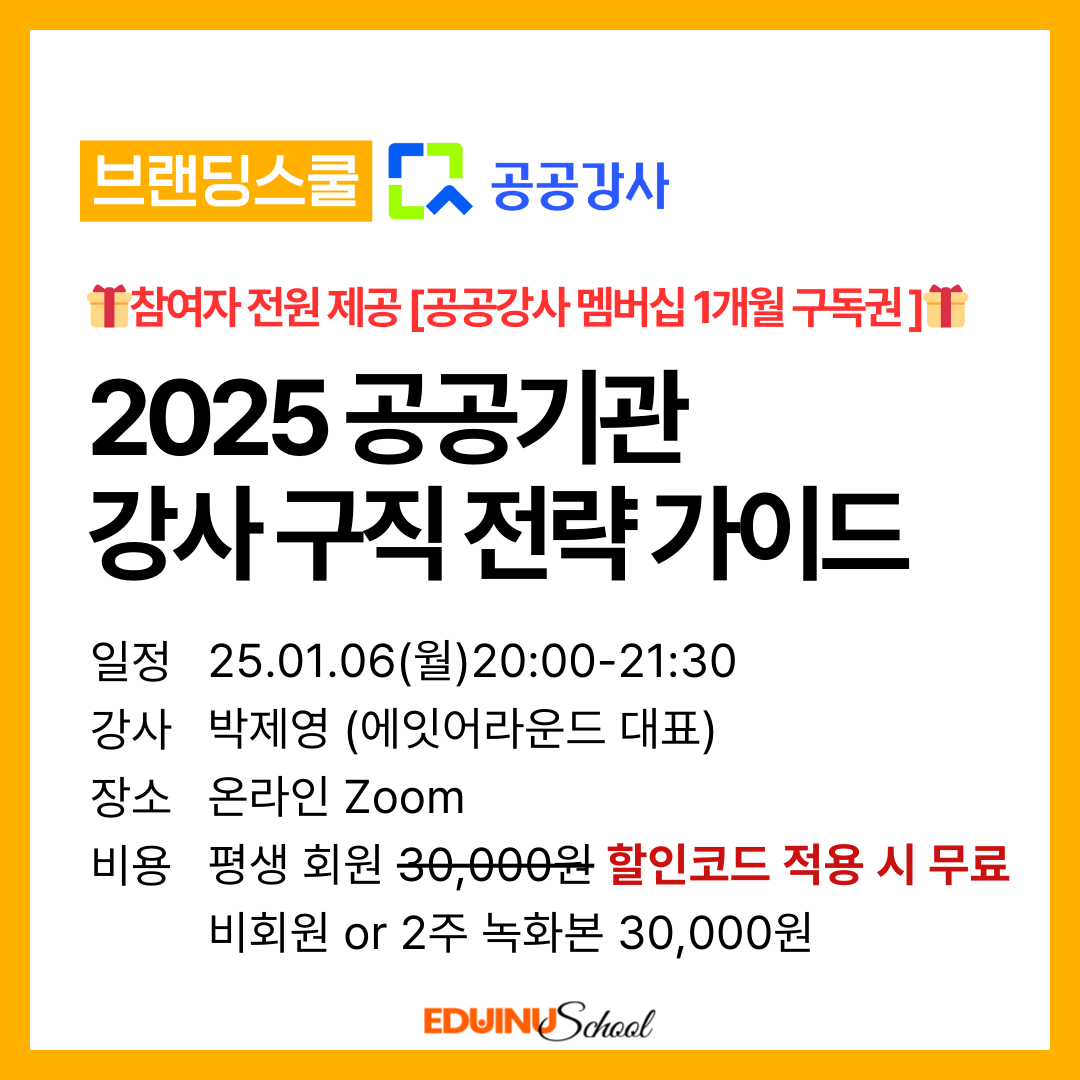 1/6 브랜딩스쿨 X 공공강사 : 2025 공공기관 강사 구직 전략 가이드(박제영 대표)BESTMDHOTSOLDOUT